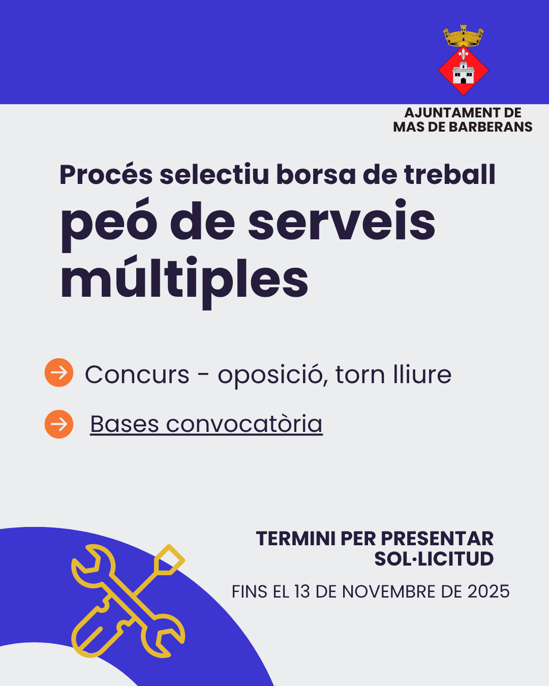 Les bases i convocatòria es pot consultar a: https://www.dipta.cat/bopt/web/anunci/351312/borsa-de-treball-de-peo-de-serveis-multiples-bases-i-convocatoria-ajuntament-mas-de-barberans